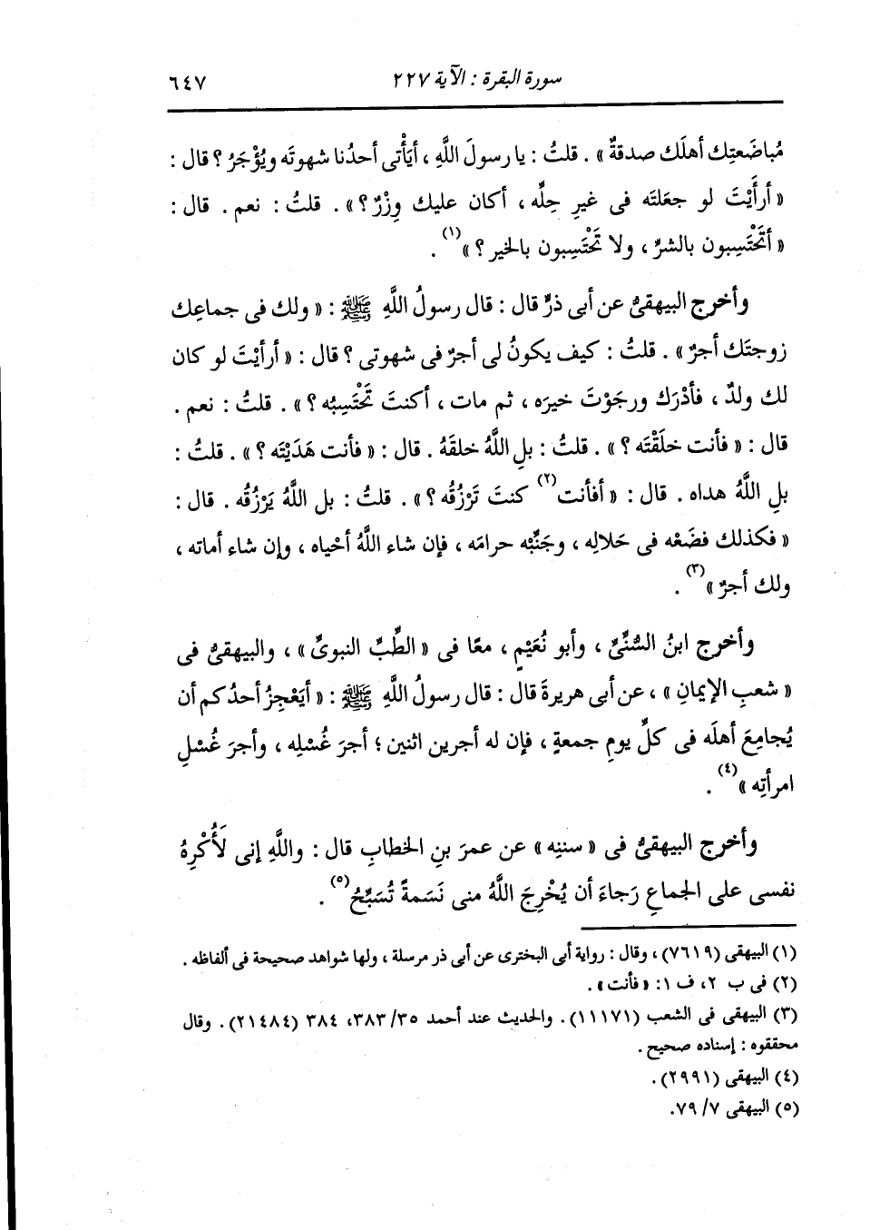 وأخرج البيهقي في الشعب عن أبي ذرة قال : قال رسول الله صلى الله عليه وسلم ولك في جماعك زوجتك أجر قلت : كيف يكون لي أجر في شهوتي قال : أرأيت لو كان لك ولد فأدرك ورجوت خيره ثم مات أكنت تحتسبه قلت : نعم ، قال : فأنت خلقته قلت : بل الله ، قال : أفأنت هديته قلت : بل الله هداه ، قال : أفأنت كنت ترزقه قلت : بل الله يرزقه ، قال : فكذلك فضعه في حلاله وجنبه حرامه فإن شاء الله أحياه وإن شاء أماته ولك أجر.
