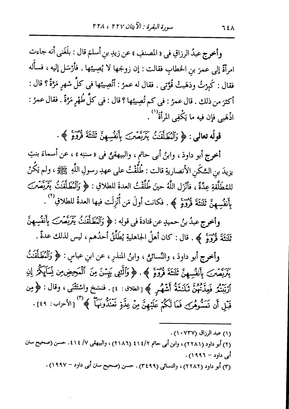 وأخرج أبو داود والنسائي ، وَابن المنذر عن ابن عباس {والمطلقات يتربصن بأنفسهن ثلاثة قروء} {واللائي يئسن من المحيض من نسائكم إن ارتبتم فعدتهن ثلاثة أشهر} الطلاق الآية 4 فنسخ واستثنى وقال (ثم طلقتموهن من قبل أن تمسوهن فما لكم عليهن من عدة تعتدونها) (الأحزاب الآية 49)