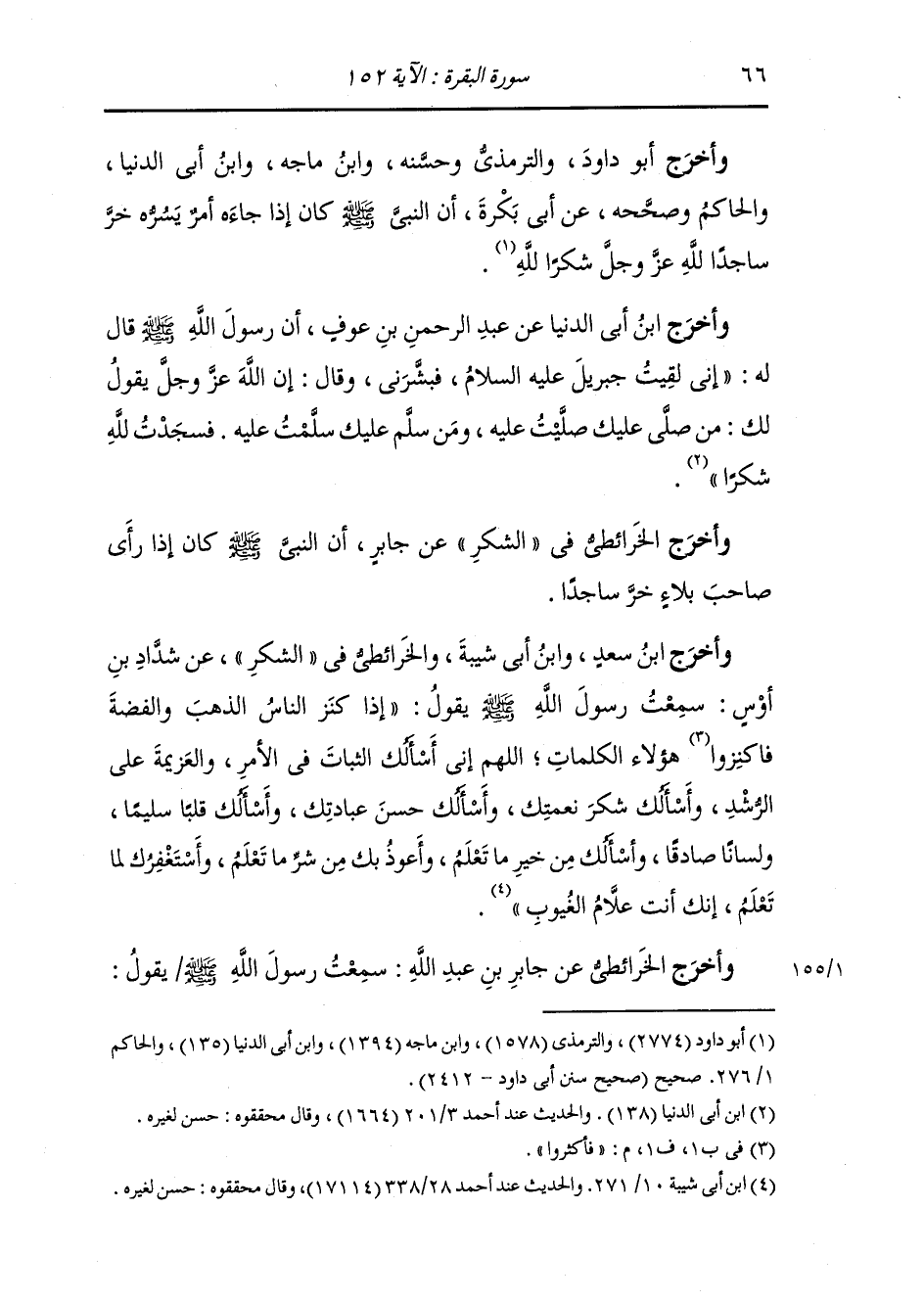 وأخرج ابن أبي الدنيا والخرائطي كلاهما في كتاب الشكر عن أبي هريرة قال : قال رسول الله صلى الله عليه وسلم من رأى صاحب بلاء فقال : الحمدلله الذي عافاني مما ابتلاك به وفضلني عليك وعلى جميع خلقه تفضيلا فقد أدى شكر النعمة.