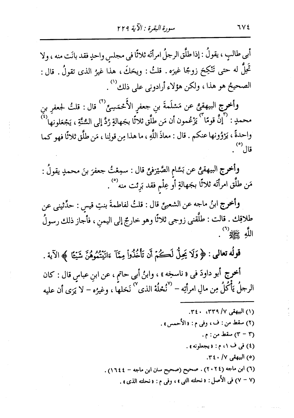 وأخرج ابن ماجة عن الشعبي قال : قلت لفاطمة بنت قيس : حدثيني عن طلاقك قالت : طلقني زوجي ثلاثا وهو خارج إلى اليمن فأجاز ذلك رسول الله صلى الله عليه وسلم ، أما قوله تعالى : {ولا يحل لكم أن تأخذوا مما آتيتموهن شيئا} الآية.