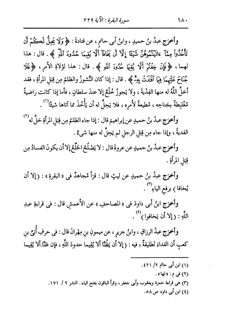 وأخرج عَبد بن حُمَيد عن الليث قال : قرأ مجاهد في البقرة (إلا أن يخافا) برفع الياء.