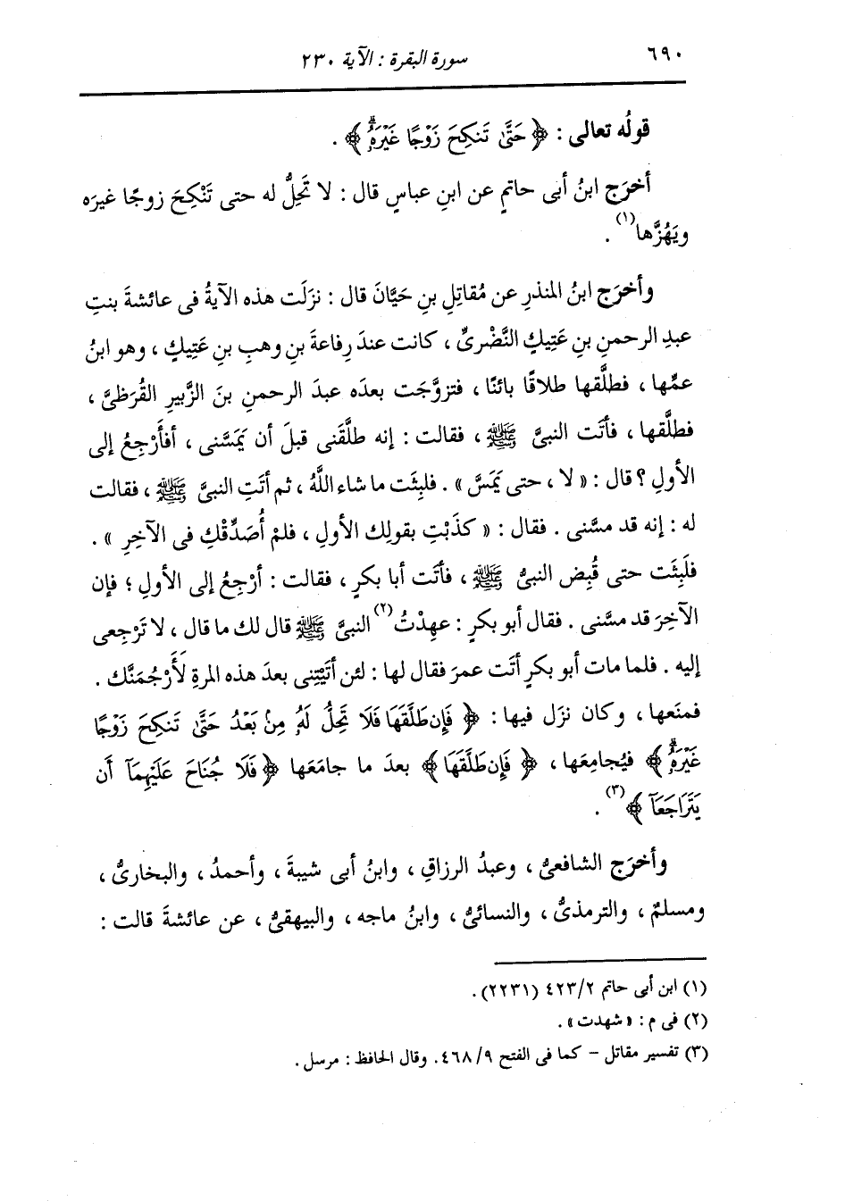 وأخرج ابن المنذر عن مقاتل بن حيان قال نزلت هذه الآية في عائشة بنت عبد الرحمن بن عتيك النضري كانت عند رفاعة بن عتيك وهو ابن عمها فطلقها طلاقا بائنا فتزوجت بعده عبد الرحمن بن الزبير القرظي فطلقها فأتت النَّبِيّ صلى الله عليه وسلم فقالت : إنه طلقني قبل أن يمسني أفأراجع إلى الأول قال : لا حتى يمس ، فلبثت ما شاء الله ثم أتت النَّبِيّ صلى الله عليه وسلم فقالت له : إنه قد مسني ، فقال :