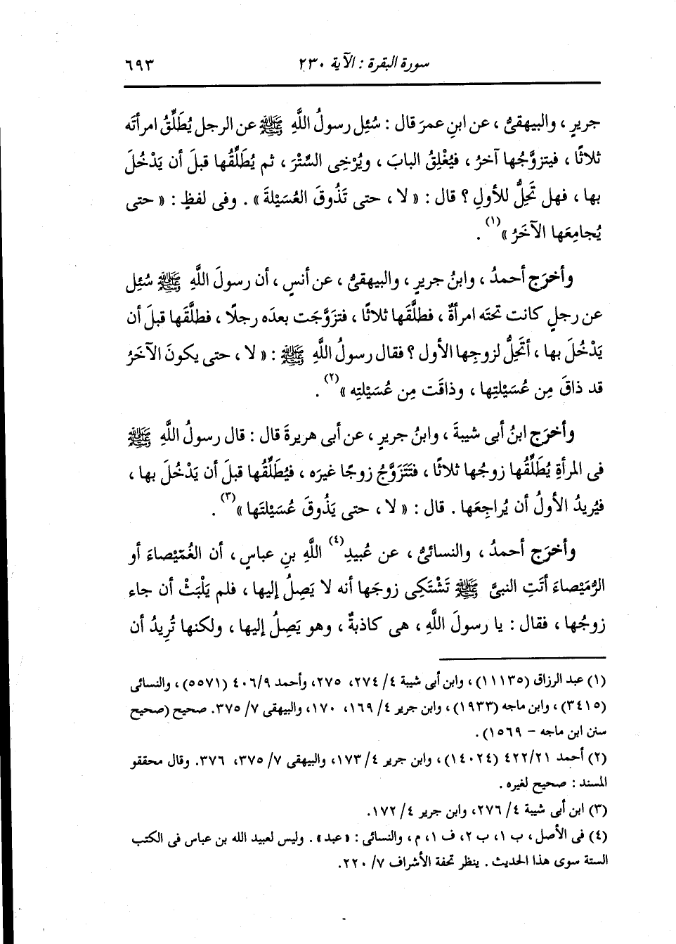 جرير والبيهقي عن ابن عمر قال سئل رسول الله صلى الله عليه وسلم عن الرجل يطلق امرأته ثلاثا فيتزوجها آخر فيغلق الباب ويرخي الستر ثم يطلقها قبل أن يدخل بها فهل تحل للأول قال : لا حتى تذوق عسيلته ، وفي لفظ : حتى يجامعها الآخر.