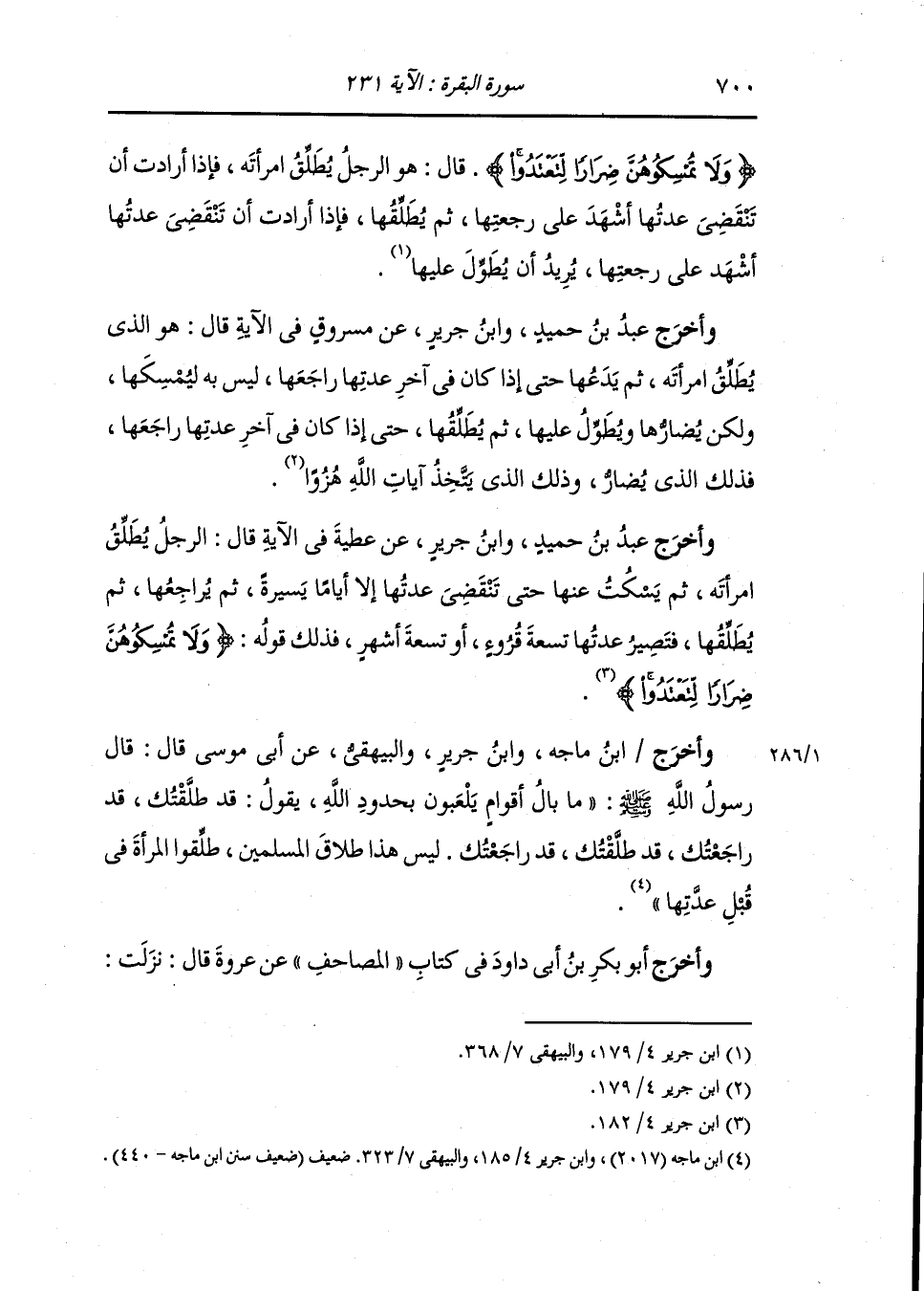 {ولا تمسكوهن ضرارا لتعتدوا} قال : هو الرجل يطلق امرأته فإذا أرادت أن تنقضي عدتها أشهد على رجعتها ثم يطلقها فإذا أرادت أن تنقضي عدتها أشهد على رجعتها يريد أن يطول عليها.