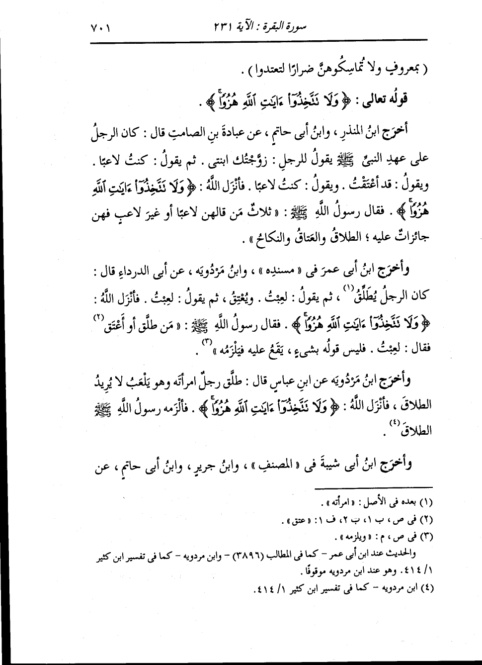 وأخرج ابن مردويه عن ابن عباس قال طلق رجل امرأته وهو يلعب لا يريد الطلاق فأنزل الله {ولا تتخذوا آيات الله هزوا} فألزمه رسول الله صلى الله عليه وسلم الطلاق.