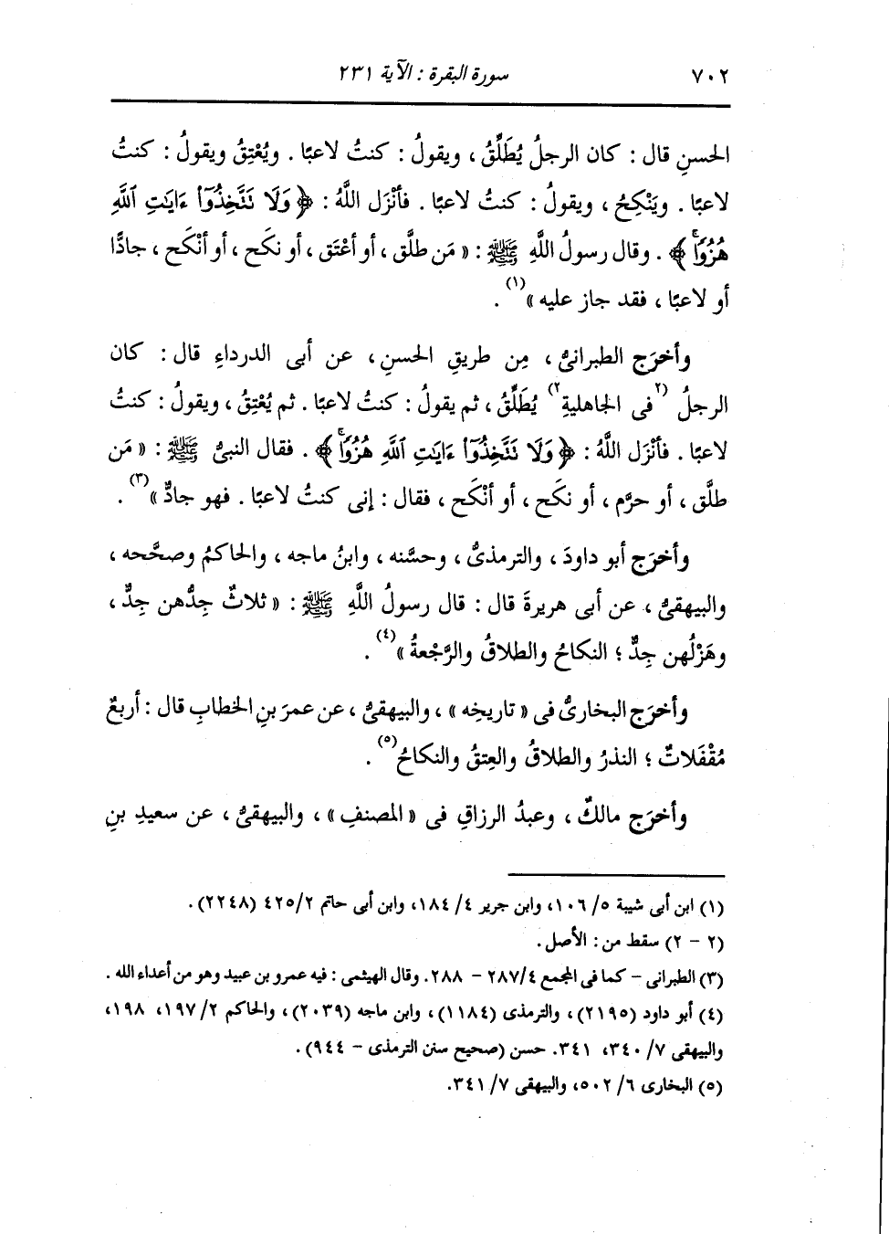 وأخرج الطبراني من طريق الحسن عن أبي الدرداء قال : كان الرجل في الجاهلية يطلق ثم يقول : كنت لاعبا ثم يعتق ويقول : كنت لاعبا ، فأنزل الله {ولا تتخذوا آيات الله هزوا} فقال النَّبِيّ صلى الله عليه وسلم من طلق أو حرم أو نكح أو أنكح فقال : إني كنت لاعبا فهو جاد.