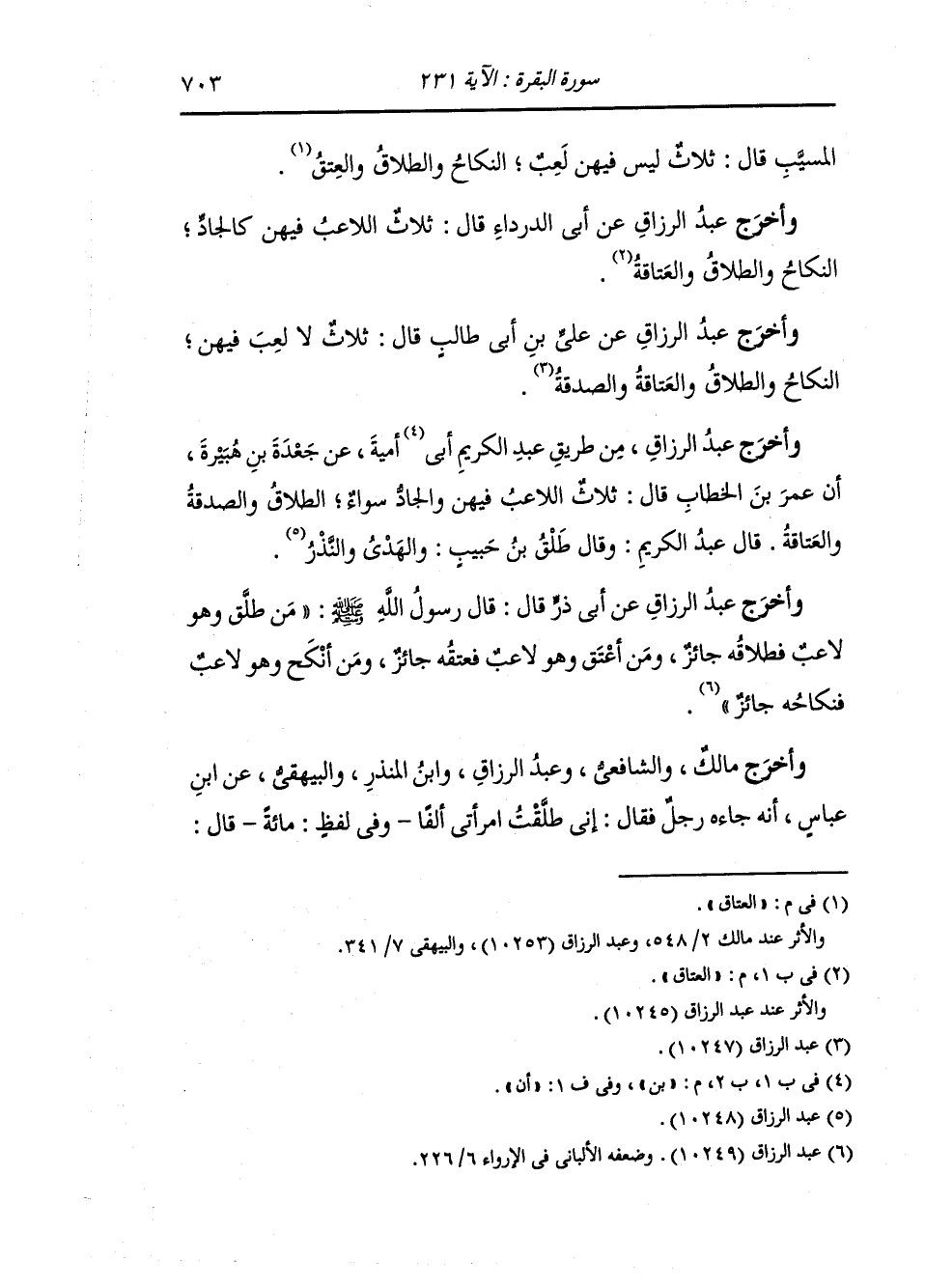وأخرج عبد الرزاق عن علي بن أبي طالب قال : أربع لا لعب فيهن : النكاح والطلاق والعتاقة والصدقة.