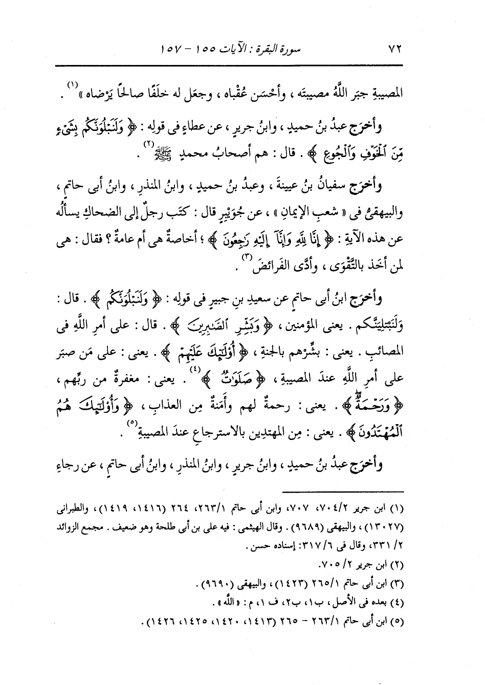 أخرج ابن جرير ، وَابن المنذر ، وَابن أبي حاتم والطبراني والبيهقي في شعب الإيمان عن ابن عباس في قوله {ولنبلونكم} الآية ، قال : أخبر الله المؤمنين أن الدنيا دار بلاء وأنه مبتليهم فيها وأمرهم بالصبر وبشرهم فقال {وبشر الصابرين} ، وأخبر أن المؤمن إذا سلم لأمر الله ورجع واسترجع عند المصيبة كتب الله له ثلاث