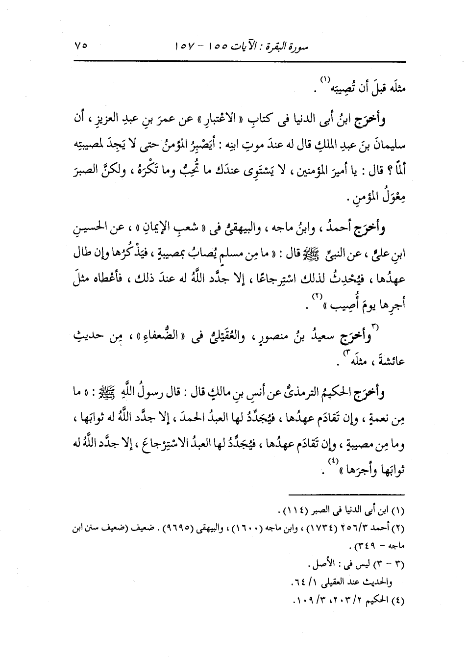 وأخرج وكيع وسعيد بن منصور ، وعَبد بن حُمَيد ، وَابن أبي الدنيا في كتاب العزاء ، وَابن المنذر والحاكم وصححه والبيهقي في شعب الإيمان عن عمر بن الخطاب قال : نعم العدلان ونعم العلاوة {الذين إذا أصابتهم مصيبة قالوا إنا لله وإنا إليه راجعون أولئك عليهم صلوات من ربهم ورحمة} نعم العدلان {وأولئك هم المهتدون} نعم العلاوة.