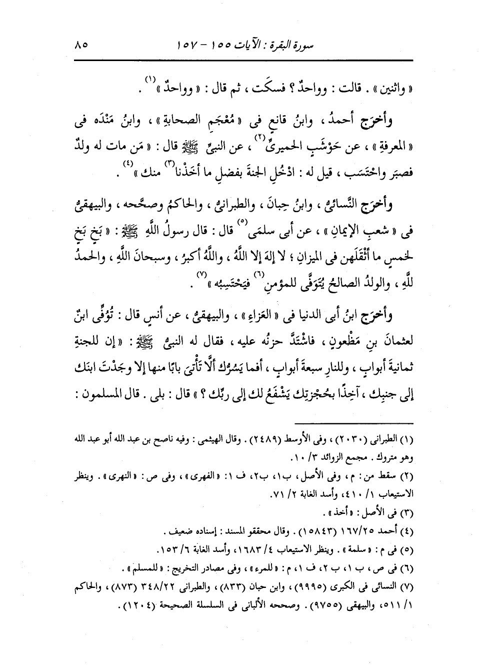 وأخرج أحمد والبيهقي في شعب الإيمان ، عَن جَابر سمعت رسول الله صلى الله عليه وسلم يقول : من مات له ثلاثة من الولد فاحتسبهم دخل الجنة ، فقالت امرأة : واثنين ، قال : واثنين.