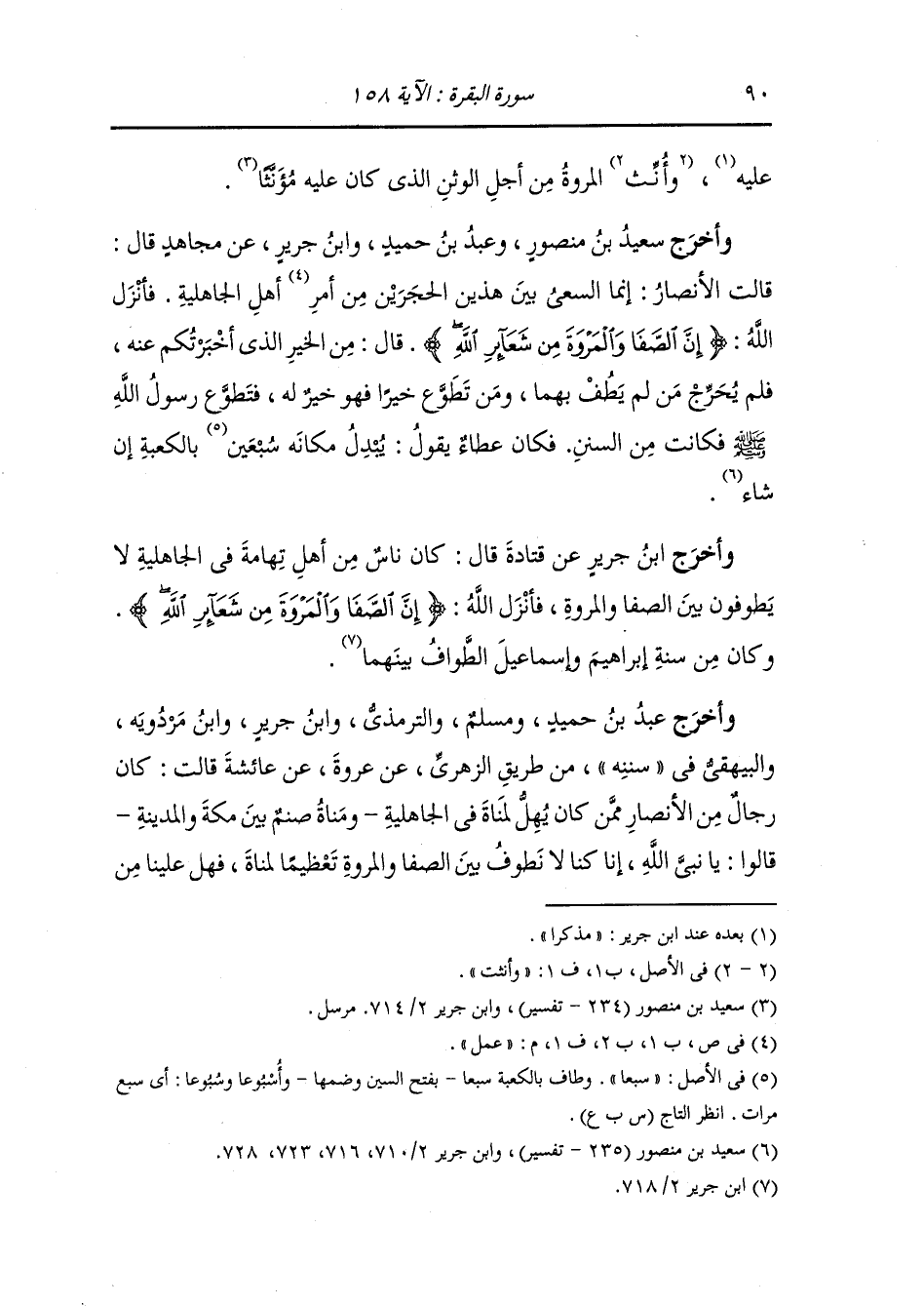 وأخرج ابن جرير عن ابن عباس في قوله {إن الصفا والمروة من شعائر الله} الآية ، وذلك أن ناسا تحرجوا أن يطوفوا بين الصفا والمروة فأخبر الله أنهما من شعائره الطواف بينهما أحب إليه فمضت السنة بالطواف بينهما.