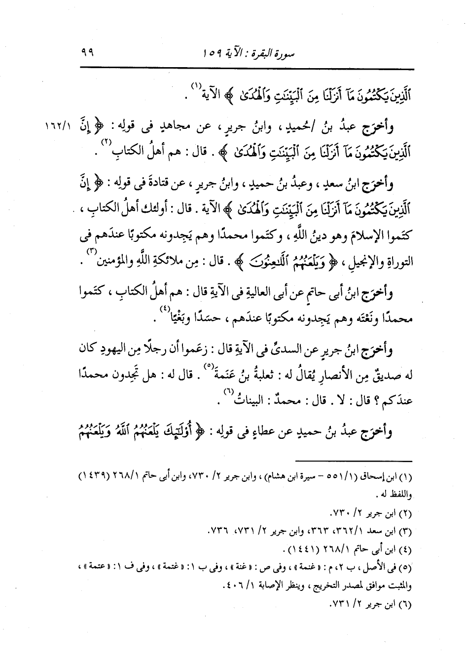 أخرج ابن إسحاق ، وَابن جَرِير ، وَابن المنذر ، وَابن أبي حاتم عن ابن عباس قال : سأل معاذ بن جبل أخو بني سلمة وسعد بن معاذ أخو بني الأشهل وخارجة بن زيد أخو الحرث بن الخزرج نفرا من أحبار اليهود عن بعض ما في التوراة فكتموهم إياه وأبوا أن يخبروهم فأنزل الله فيهم {إن