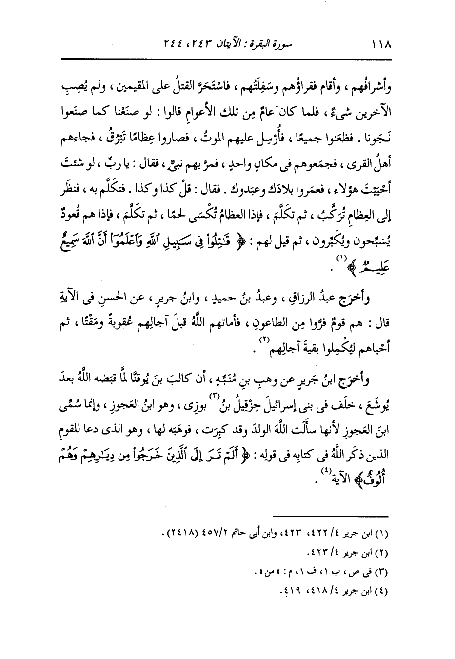 وأخرج عَبد بن حُمَيد عن قتادة في قوله {ألم تر إلى الذين خرجوا من ديارهم وهم ألوف حذر الموت} قال : مقتهم الله على فرارهم من الموت فأماتهم الله عقوبة الله ثم بعثهم إلى بقية آجالهم ليستوفوها ولو كانت آجال القوم جاءت ما بعثوا بعد موتهم.