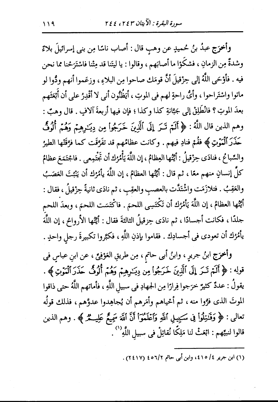 وأشرافهم وأقام فقراؤهم وسفلتهم فاستحر القتل على المقيمين ولم يصب الآخرين شيء فلما كان عام من تلك الأعوام قالوا : لو صنعنا كما صنعوا نجونا فظعنوا جميعا فأرسل عليهم الموت فصاروا عظاما تبرق فجاءهم أهل القرى فجمعوهم في مكان واحد فمر بهم نبي فقال : يا رب لو شئت أحييت هؤلاء فعمروا بلادك وعبدوك ، فقال : قل كذا وكذا فتكلم به فنظر إلى العظام تركب ثم تكلم فإذا العظام تكسى لحما ثم تكلم فإذا هم قعود يسبحون ويكبرون ثم قيل لهم {وقاتلوا في سبيل الله واعلموا أن الله سميع عليم}.