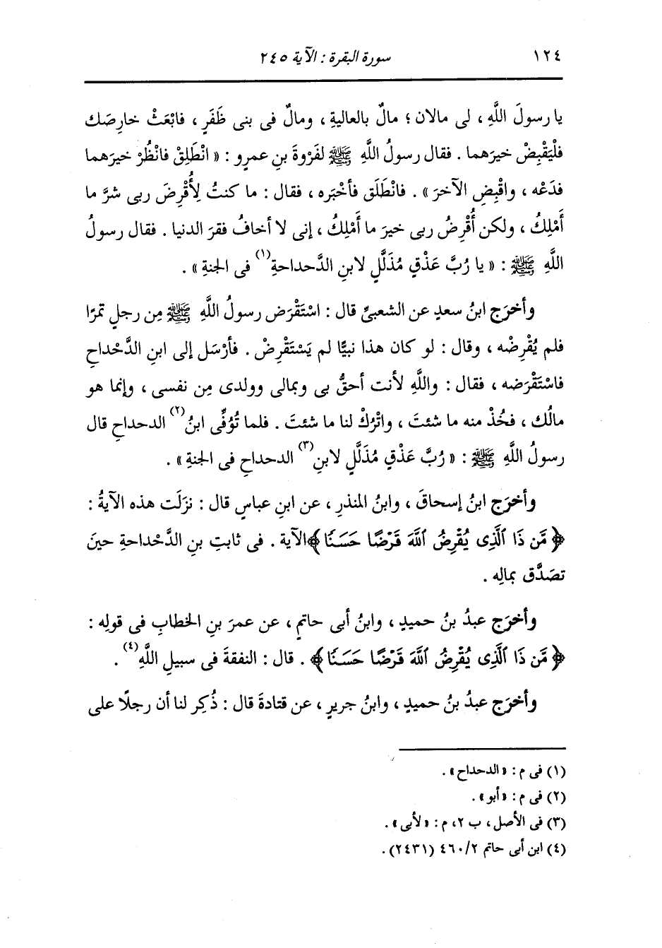 وَأخرَج ابن مردويه من طريق زيد بن أسلم عن عطاء بن يسار وعن الأعرج عن أبي هريرة قال: لما نزلت : (من ذا الذي يقرض الله قرضا حسنا) قال أبو الدحداح : يارسول الله، لي حائطان أحدهما بالسافلة والأخر بالعالية وقد أقرضت ربي أحدهما . فقال النَّبِيّ صلى الله عليه وسلم : قد قبله منك". فأعطاه النَّبِيّ صلى الله عليه وسلم اليتامى الذين في حجره ، فكان النَّبِيّ صلى الله عليه وسلم يقول : رب عذق لبي الدحداح مدلى في الجنة .