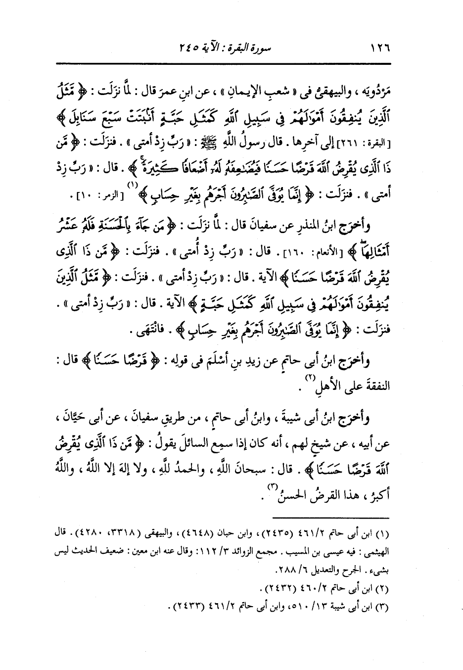 أو ليس تجدون هذا في كتاب الله {من ذا الذي يقرض الله قرضا حسنا فيضاعفه له أضعافا كثيرة} فالكثيرة عند الله أكثر من ألف ألف وألفي ألف والذي نفسي بيده لقد سمعت رسول الله صلى الله عليه وسلم يقول إن الله يضاعف الحسنة ألفي ألف حسنة.