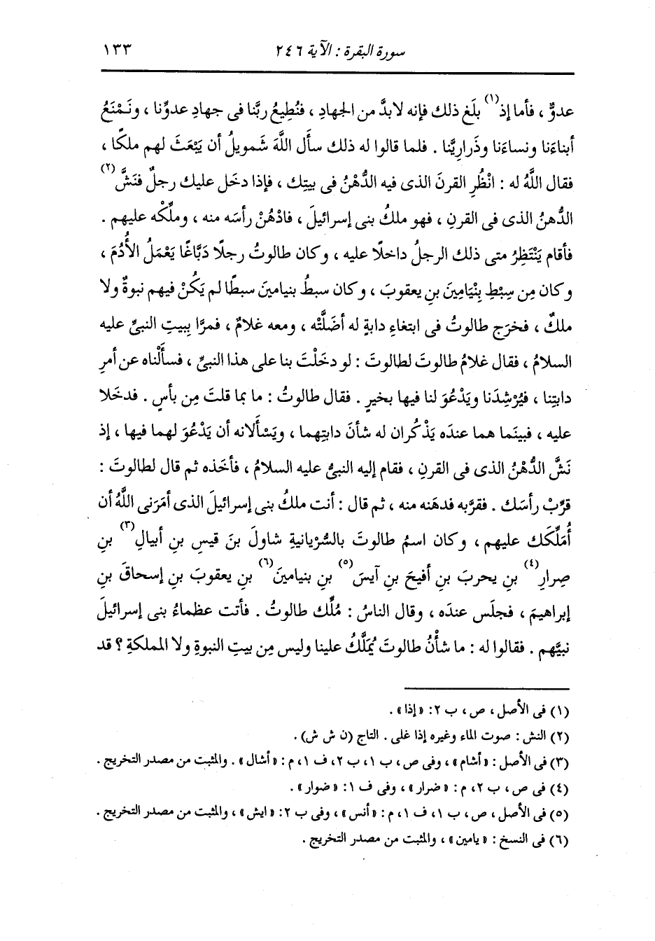 فيه السكينة وبقة مما ترك آل موسى وآل هرون وكان لا يلقاهم عدو فيقدمون التابوت ويرجعون به معهم إلا هزم الله ذلك العدو فلما عظمت أحداثهم وتركوا عهد الله إليهم نزل بهم عدو فخرجوا إليه وأخرجوا معهم التابوت كما كانوا يخرجونه ثم زحفوا به فقوتلوا حتى استلب من أيديهم فمرج أمره عليهم ووطئهم عدوهم حتى اصاب من أبنائهم ونسائهم وفيهم نبي يقال له شمويل وهو الذي ذكره الله في قوله {ألم تر إلى الملإ من بني إسرائيل من بعد موسى إذ قالوا لنبي لهم} الآية ، فكلموه وقالوا {ابعث لنا ملكا نقاتل في سبيل الله} ، وإنما كان قوام بني اسرائيل الاجتماع على الملوك وطاعة الملوك أنبياءهم وكان الملك هو يسير بالجموع والنبي يقوم له بأمره ويأتيه بالخبر من ربه فإذا فعلوا ذلك صلح أمرهم فإذا عتت ملوكهم وتركوا أمر أنبيائهم فسد أمرهم فكانت الملوك إذا تابعتها الجماعة على الضلالة تركوا أمر الرسل ففريقا يكذبون فلا يقبلون منه شيئا وفريقا يقتلون فلم يزل ذلك البلاء بهم حتى قالوا {ابعث لنا ملكا نقاتل في سبيل الله} فقال لهم : إنه ليس عندكم وفاء ولا صدق ولا رغبة في الجهاد ، فقالوا : إنا كنا نهاب الجهاد ونزهد فيه إنا كنا ممنوعين في بلادنا لا يطؤها أحد فلا يظهر علينا