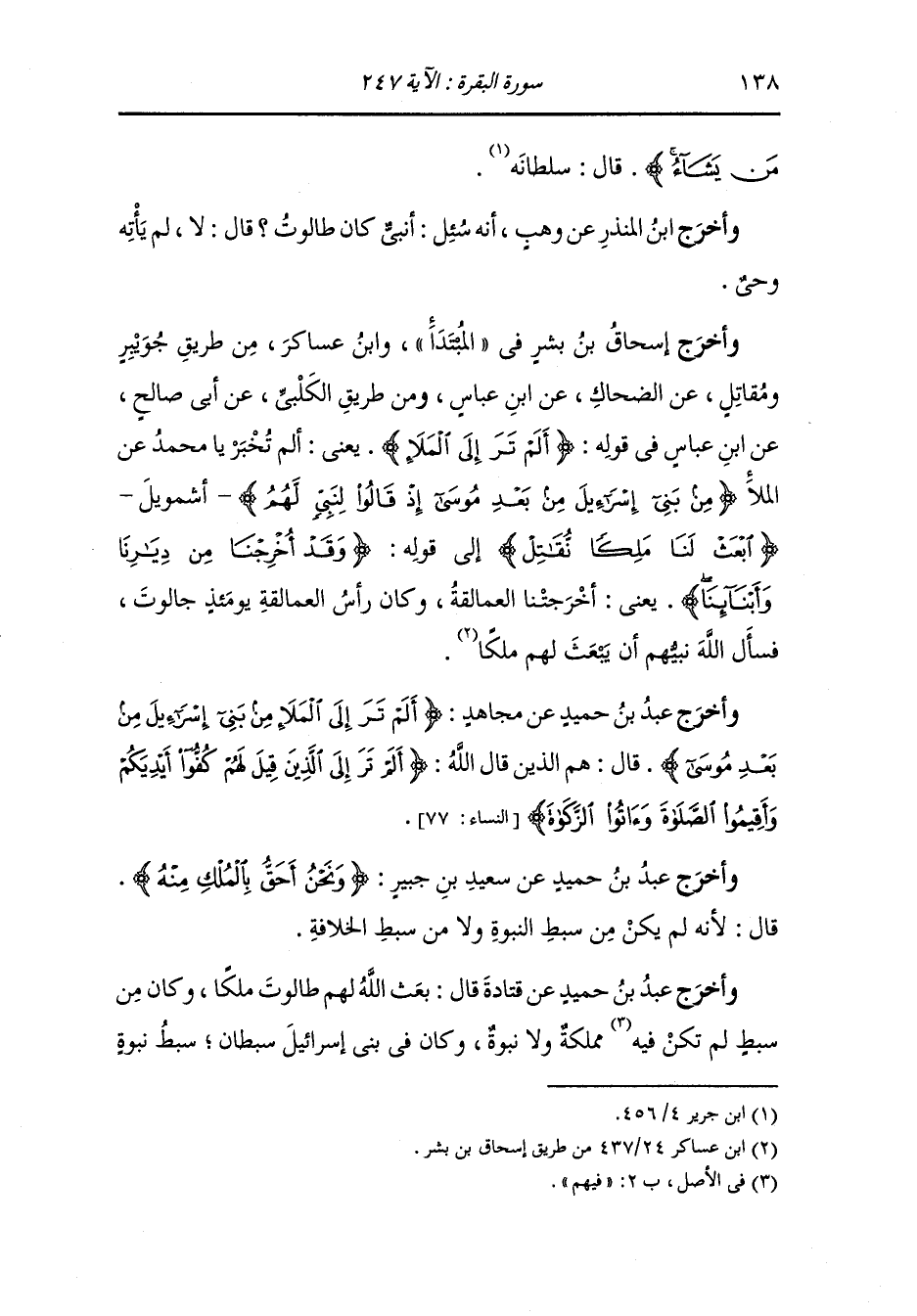 وأخرج ابن ابي حاتم من طريق السدي عن أبي مالك عن ابن عباس {وزاده بسطة} يقول : فضيلة {في العلم والجسم} يقول : كان عظيما جسيما يفضل بني اسرائيل بعنقه.