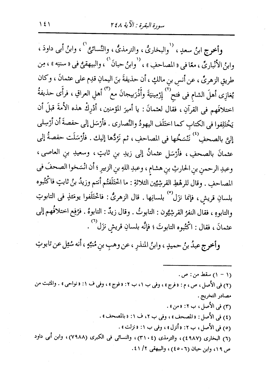 وأخرج سعيد بن منصور ، وعَبد بن حُمَيد عن عمرو بن دينار ، أن عثمان بن عفان أمر فتيان المهاجرين والأنصار أن يكتبوا المصاحف قال : فما اختلفتم فيه فاجعلوه بلسان قريش ، فقال المهاجرون : التابوت ، وقال الأنصار : التابوه ، فقال عثمان : اكتبوه بلغة المهاجرين ، التابوت