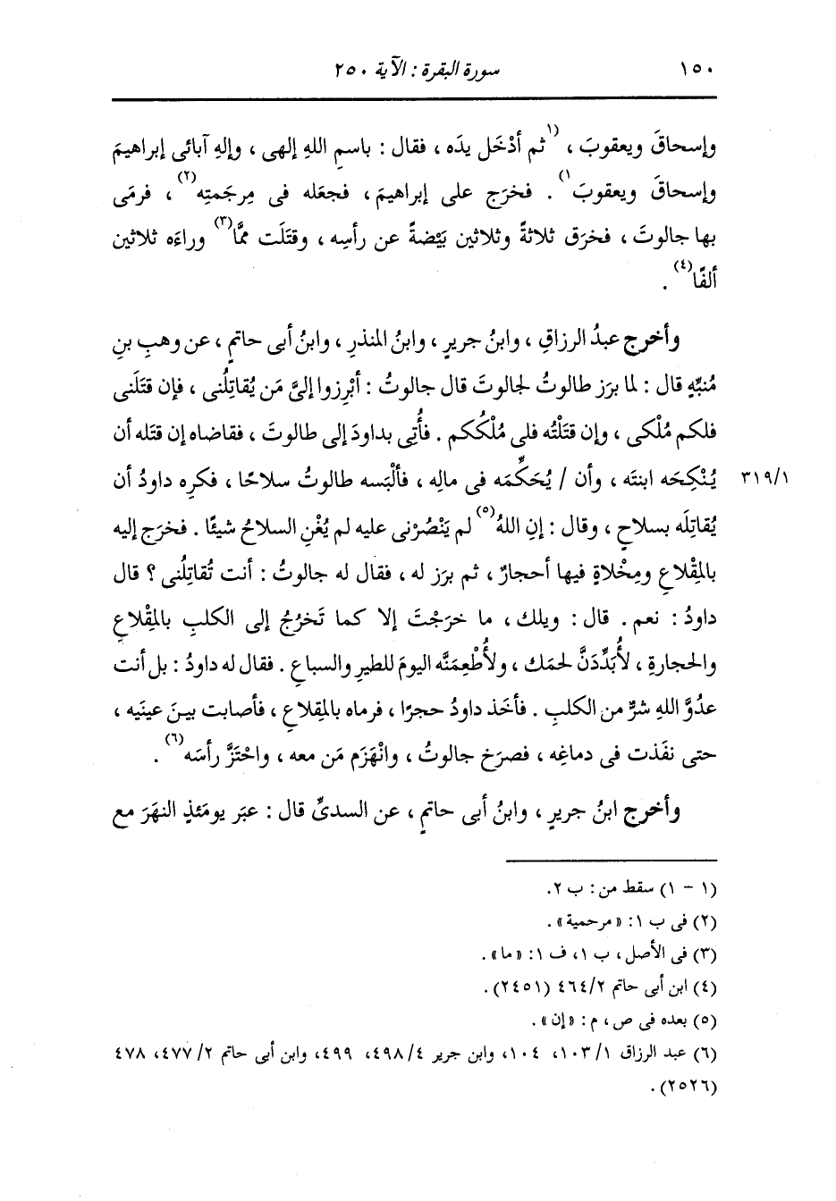أخرج الفريابي ، وعَبد بن حُمَيد ، وَابن المنذر ، وَابن أبي حاتم عن مجاهد قال : كان طالوت أميرا على الجيش فبعث أبو داود بشيء إلى إخوته فقال داود لطالوت : ماذا لي وأقتل جالوت فقال : لك ثلث ملكي وأنكحك ابنتي فأخذ مخلاة فجعل فيها ثلاث مروات ثم سمى إبراهيم