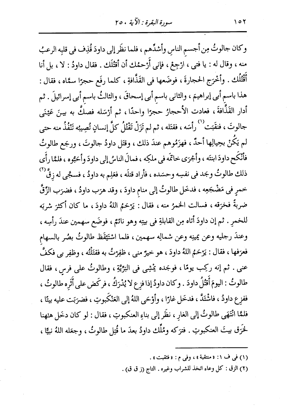 طالوت أبو داود فيمن عبر مع ثلاثة عشر ابنا له وكان داود أصغر بنيه وأنه أتاه ذات يوم فقال : يا أبتاه ما أرمي بقذافتي شيئا إلا صرعته قال : أبشر فإن الله قد جعل رزقك في قذافتك ثم أتاه يوما فقال : يا أبتاه لقد دخلت بين الجبال فوجدت أسدا رابضا فركبت عليه وأخذت بأذنيه فلم يهجني ، فقال : أبشر يا بني فإن هذا خير يعطيكه الله ثم أتاه يوما آخر فقال : يا أبتاه إني لأمشي بين الجبال فأسبح فما يبقى جبل إلا سبح معي ، قال : ابشر يا بني فإن هذا خير أعطاكه الله وكان داود راعيا وكان أبوه خلفه يأتي إليه وإلى أخوته بالطعام فأتى النَّبِيّ بقرن فيه دهن وبثوب من حديد فبعث به إلى طالوت فقال : إن صاحبكم الذي يقتل جالوت يوضع هذا القرن على رأسه فيغلي حين يدهن منه ولا يسيل على وجهه يكون على رأسه كهيئة الأكليل ويدخل في هذا الثوب فيملؤه فدعا طالوت بني اسرائيل فجربه فلم يوافقه منهم أحد فلما فرغوا قال طالوت لأبي داود : هل بقي لك ولد لم يشهدنا قال : نعم بقي ابني داود وهو يأتينا بطعامنا فلما أتاه داود مر في الطريق بثلاثة أحجار فكلمنه وقلن له : يا داود تقتل بنا جالوت فأخذهن فجعلهن في مخلاته وقد كان طالوت قال : من قتل جالوت زوجته ابنتي وأجريت خاتمه في ملكي فلما جاء داود وضعوا القرن على رأسه فغلى حتى ادهن منه ولبس الثوب فملأه وكان رجلا مسقاما مصفارا ولم يلبسه أحد إلا تقلقل فيه فلما لبسه داود تضايق عليه الثوب حتى تنقص ثم مشى إلى جالوت