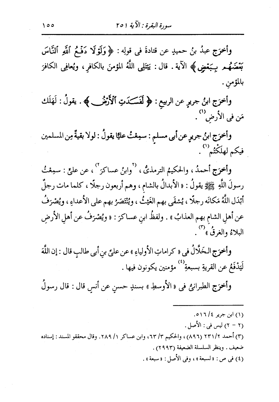 أخرج ابن جرير ، وَابن عدي بسند ضعيف عن ابن عمر قال : قال رسول الله صلى الله عليه وسلم إن الله ليدفع بالمسلم الصالح عن مائة أهل بيت من جيرانه البلاء ثم قرأ ابن عمر {ولولا دفع الله الناس بعضهم ببعض لفسدت الأرض}.