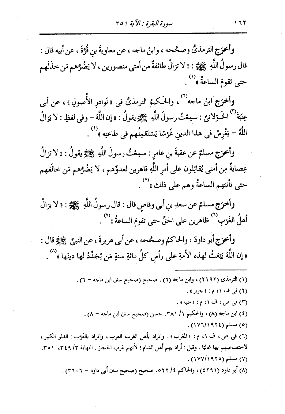وأخرج الحاكم وصححه عن عمر بن الخطاب قال : قال رسول الله صلى الله عليه وسلم لا تزال طائفة من أمتي ظاهرين على الحق حتى تقوم الساعة.