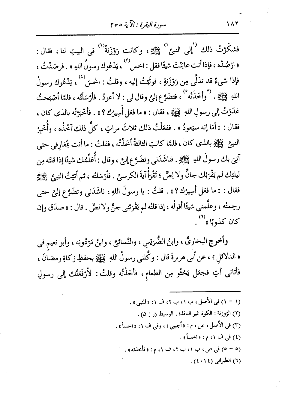 فقلت : أجيبي رسول الله صلى الله عليه وسلم فتحولت عجوزا وقالت : أذكرك الله لما تركتني فإني غير عائدة ، فتركتها فأتيت النَّبِيّ صلى الله عليه وسلم فقال : ما فعل الرجل فأخبرته بخبرها ، فقال : كذبت وهي عائدة ، فقل لها : أجيبي رسول الله فتحولت عجوزا ، وقالت : أذكرك الله يا أبا أيوب لما تركتني هذه المرة فإني غير عائدة ، فتركتها ثم أتيت النَّبِيّ صلى الله عليه وسلم ، فقال كما قال لي فعلت ذلك ثلاث مرات فقالت لي في الثالثة : أذكرك الله يا أبا أيوب حتى أعلمك شيئا لا يسمعه شيطان فيدخل ذلك البيت فقلت : ما هو فقالت :
