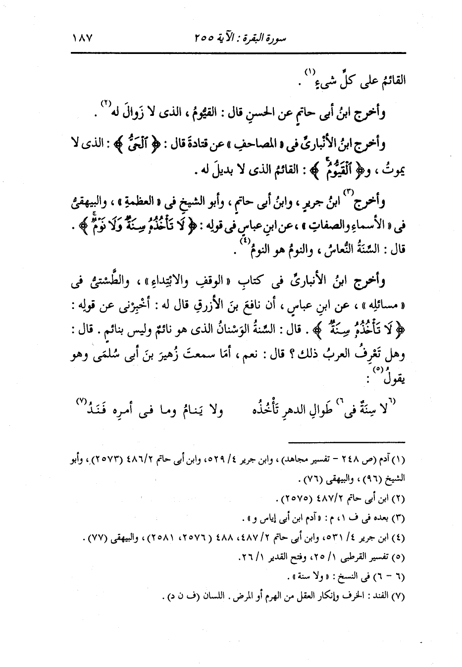 وأخرج آدم بن أبي إياس ، وَابن جَرِير والبيهقي في الأسماء والصفات عن مجاهد في قوله {القيوم} قال :