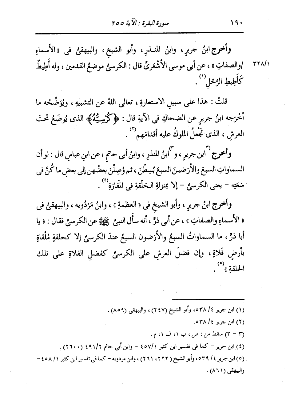 وأخرج الخطيب في تاريخه عن ابن عباس قال : سئل النَّبِيّ صلى الله عليه وسلم عن قول الله {وسع كرسيه السماوات والأرض} قال كرسيه موضع قدمه والعرش لا يقدر قدره.