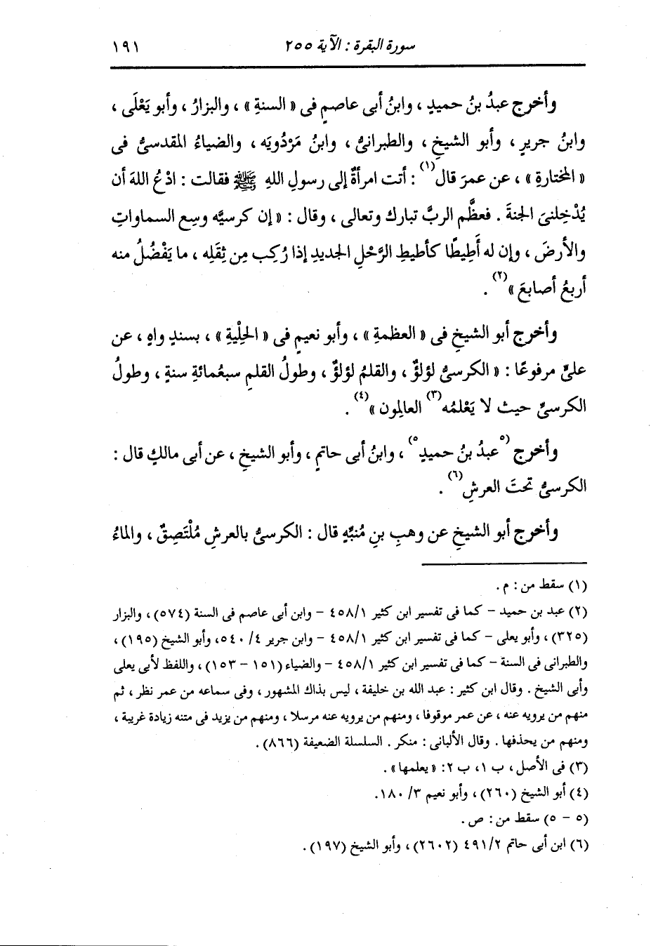 وأخرج ابن جرير وأبو الشيخ في العظمة ، وَابن مردويه والبيهقي في الأسماء والصفات عن أبي ذر أنه سأل النَّبِيّ صلى الله عليه وسلم عن الكرسي فقال : يا أبا ذر ما السموات السبع والأرضين السبع عند الكرسي إلا كحلقة ملقاة بأرض فلاة وإن فضل العرش على الكرسي كفضل الفلاة على تلك الحلقة