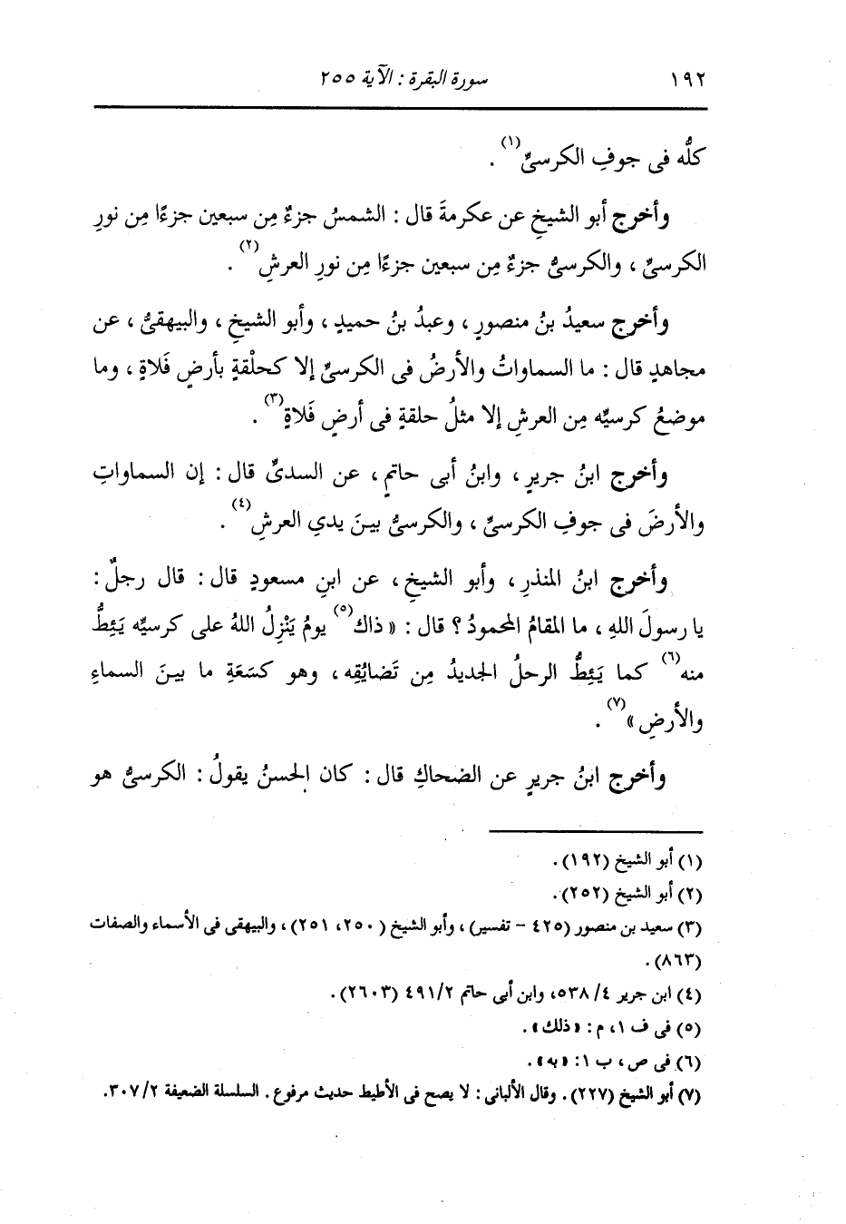 وأخرج أبو الشيخ في العظمة وأبو نعيم في الحلية بسند واه عن علي مرفوعا الكرسي لؤلؤ والقلم لؤلؤ وطول القلم سبعمائة سنة وطول الكرسي حيث لا يعلمه العالمون.