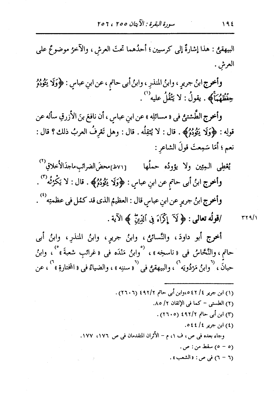 وأخرج البيهقي في الأسماء والصفات من طريق السدي عن أبي مالك وعن أبي صالح عن ابن عباس وعن مرة الهمذاني عن ابن مسعود وناس من أصحاب النَّبِيّ صلى الله عليه وسلم ، في قوله {الله لا إله إلا هو الحي القيوم} الآية ، قال : أما قوله {القيوم} فهو القائم وأما السنة فهي ريح النوم التي تأخذ في الوجه فينعس الانسان وأما {ما بين أيديهم} فالدنيا {وما خلفهم} الآخرة وأما {ولا يحيطون بشيء من علمه} يقول : لا يعلمون شيئا من علمه إلا بما شاء هو يعلمهم وأما {وسع كرسيه السماوات والأرض} فإن السموات والأرض في جوف الكرسي والكرسي بين يدي العرش وهو موضع قدميه وأما {لا يؤده} فلا يثقل عليه.