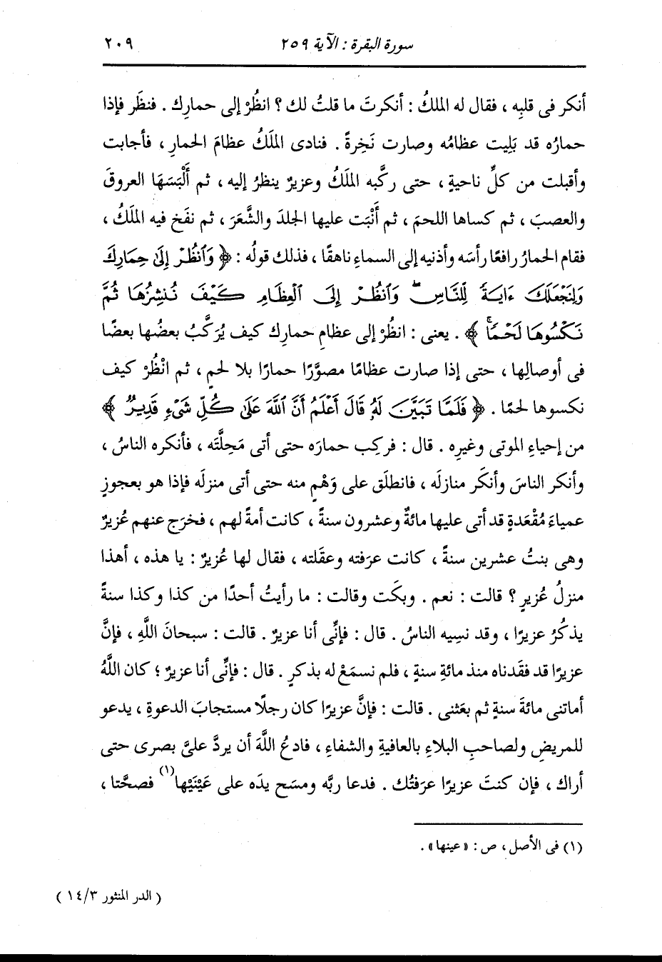 وَأخرَج قصعة معه فاعتصر من العنب الذي كان معه في القصعة ثم أخرج خبزا يابسا معه فألقاه في تلك القصعة في العصير ليبتل ليأكله ثم استلقى على قفاه وأسند رجليه إلى الحائط فنظر سقف تلك البيوت ورأى منها ما فيها وهي قائمة على عرشها وقد باد أهلها ورأى عظاما بالية فقال : {أنى يحيي هذه الله بعد موتها} فلم يشك أن الله يحييها ولكن قالها تعجبا ، فبعث الله ملك الموت فقبض روحه فأماته الله مائة عام فلما أتت عليه مائة عام وكان فيما بين ذلك في بني اسرائيل أمور وأحداث فبعث الله إلى عزير ملكا فخلق قلبه ليعقل به وعينيه لينظر بهما فيعقل كيف يحيي الله الموتى ثم ركب خلقه وهو ينظر ثم كسا عظامه اللحم والشعر والجلد ثم نفخ فيه الروح كل ذلك يرى ويعقل فاستوى جالسا فقال له الملك : كم لبثت قال : لبثت يوما وذلك أنه كان نام في صدر النهار عند الظهيرة وبعث في آخر النهار والشمس لم تغب ، فقال : أو بعض يوم ولم يتم لي يوم ، فقال له الملك : بل لبثت مائة عام فانظر إلى طعامك وشرابك يعني الطعام الخبز اليابس وشرابه العصيرالذي كان اعتصر في القصعة فإذا هما على حالهما لم يتغير العصير والخبز اليابس فذلك قوله {لم يتسنه} يعني لم يتغير وكذلك التين والعنب غض لم يتغير عن حاله فكأنه