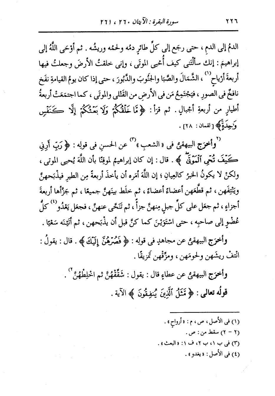 ثم فرقه على أربعة أجبال ثم نودي : أيتها العظام المتمزقة واللحوم المتفرقة والعروق المتقطعة اجتمعن يرد الله فيكن أرواحكن ، فوثب العظم إلى العظم وطارت الريشة إلى الريشة وجرى