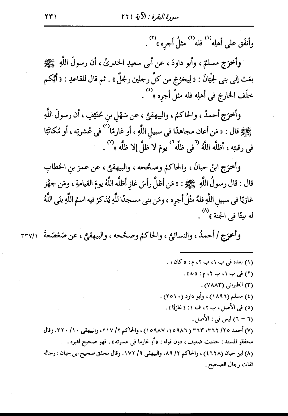 وأخرج البخاري ومسلم وأبو داوود والترمذي والنسائي ، وَابن ماجه عن زيد بن خالد الجهني أن رسول الله صلى الله عليه وسلم قال : من جهز غازيا في سبيل الله فقد غزا ومن خلف غازيا في أهله بخير فقد غزا.