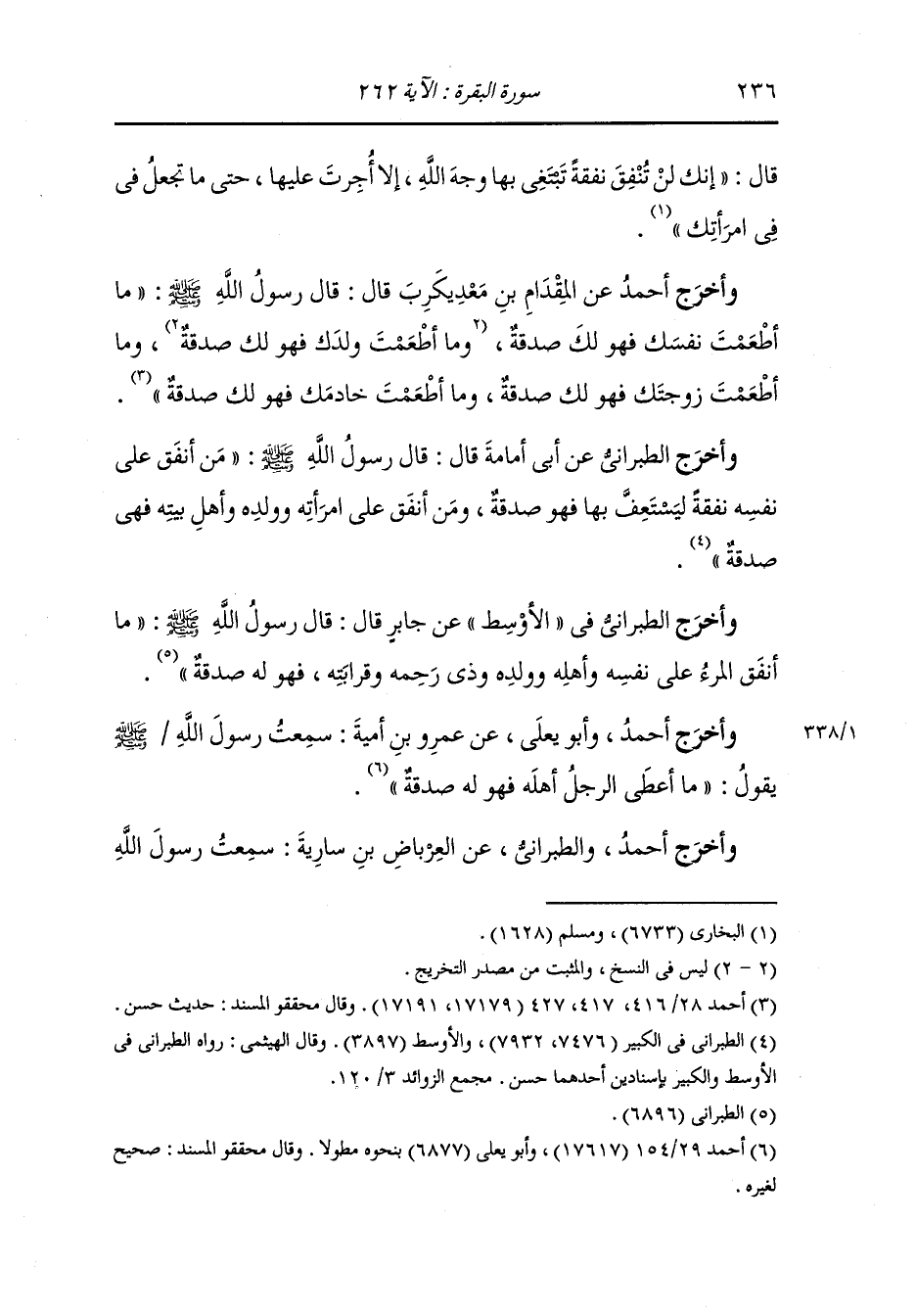 وأخرج ابن أبي شيبة والبخاري ومسلم والترمذي والنسائي عن أبي مسعود البدري عن النَّبِيّ صلى الله عليه وسلم قال إذا أنفق الرجل على أهله نفقة وهو يحتسبها كانت له صدقة.
