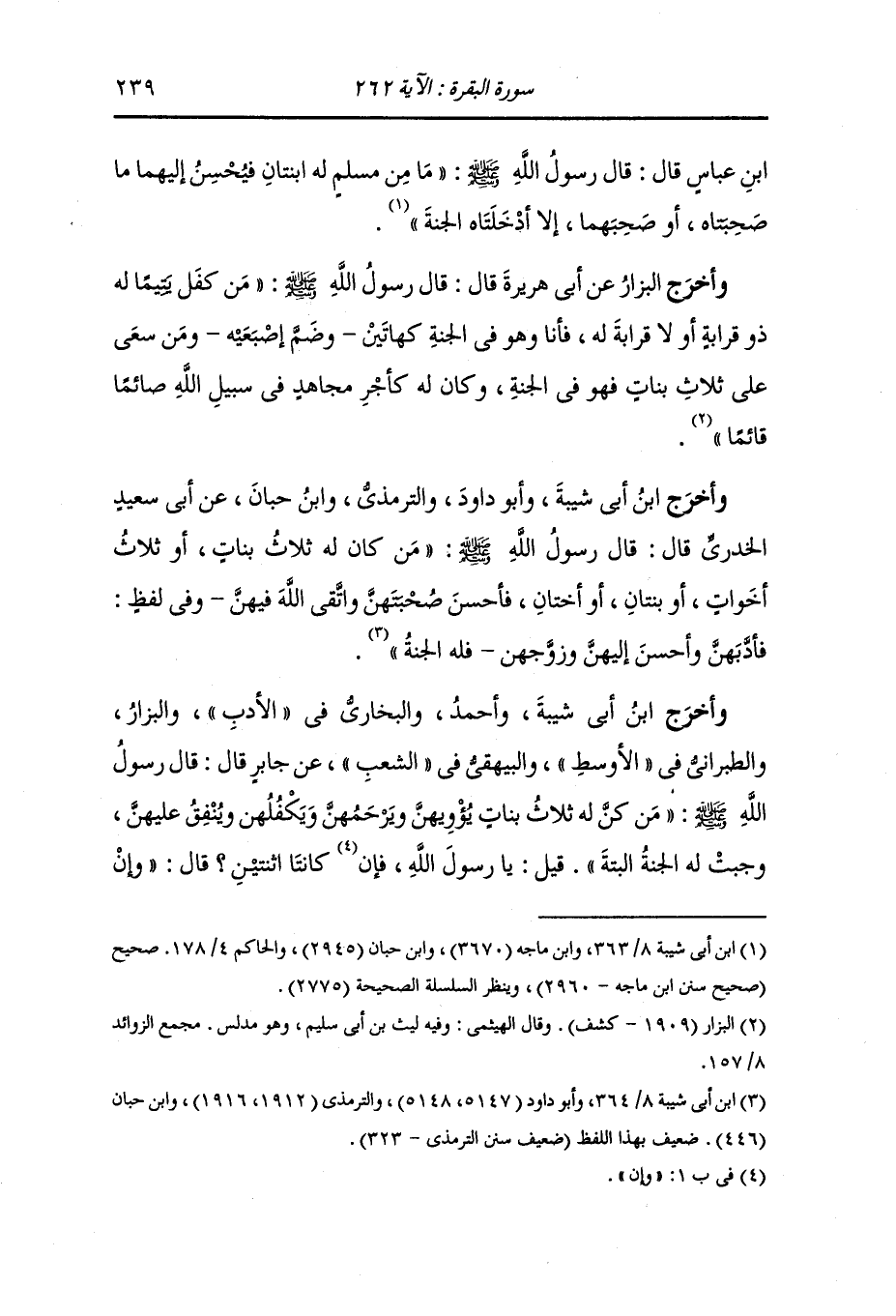 وأخرج ابن أبي شيبة ، وَابن حبان عن أنس قال : قال رسول الله صلى الله عليه وسلم من عال ابنتين أو ثلاثا أو أختين أو ثلاثا حتى يمتن أو يموت عنهن كنت أنا وهو في الجنة كهاتين وأشار بأصبعيه السبابة والتي تليها.