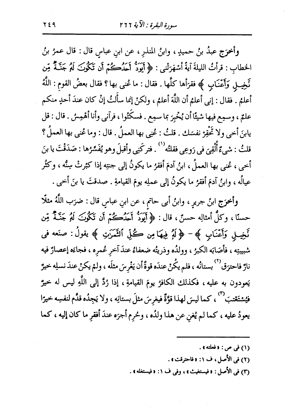 أخرج ابن المبارك في الزهد ، وعَبد بن حُمَيد والبخاري ، وَابن جَرِير ، وَابن أبي حاتم والحاكم عن ابن عباس قال : قال عمر يوما لأصحاب النَّبِيّ صلى الله عليه وسلم : فيم ترون هذه الآية نزلت {أيود أحدكم أن تكون له جنة} قالوا : الله أعلم فغضب عمر فقال : قولوا : نعلم أو لا نعلم ، فقال ابن عباس : في نفسي منها شيء يا أمير المؤمنين فقال : عمر : يا ابن أخي قل ولا تحقر نفسك ، قال ابن عباس : ضربت مثلا لعمل ، قال عمر : أي عمل قال ابن عباس : لعمل ، قال عمر : لرجل غني يعمل بطاعة الله ثم بعث الله له الشيطان فعمل بالمعاصي حتى أغرق أعماله