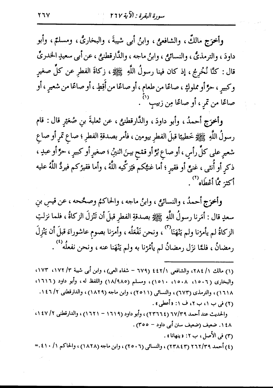 وأخرج مالك والشافعي ، وَابن أبي شيبة والبخاري ومسلم وأبو داود والترمذي والنسائي ، وَابن ماجه والدارقطني عن ابن عمر قال فرض رسول الله صلى الله عليه وسلم زكاة الفطر صاعا من تمر أو صاعا من شعير على كل حر أو عبد ذكر أو أنثى من المسلمين.