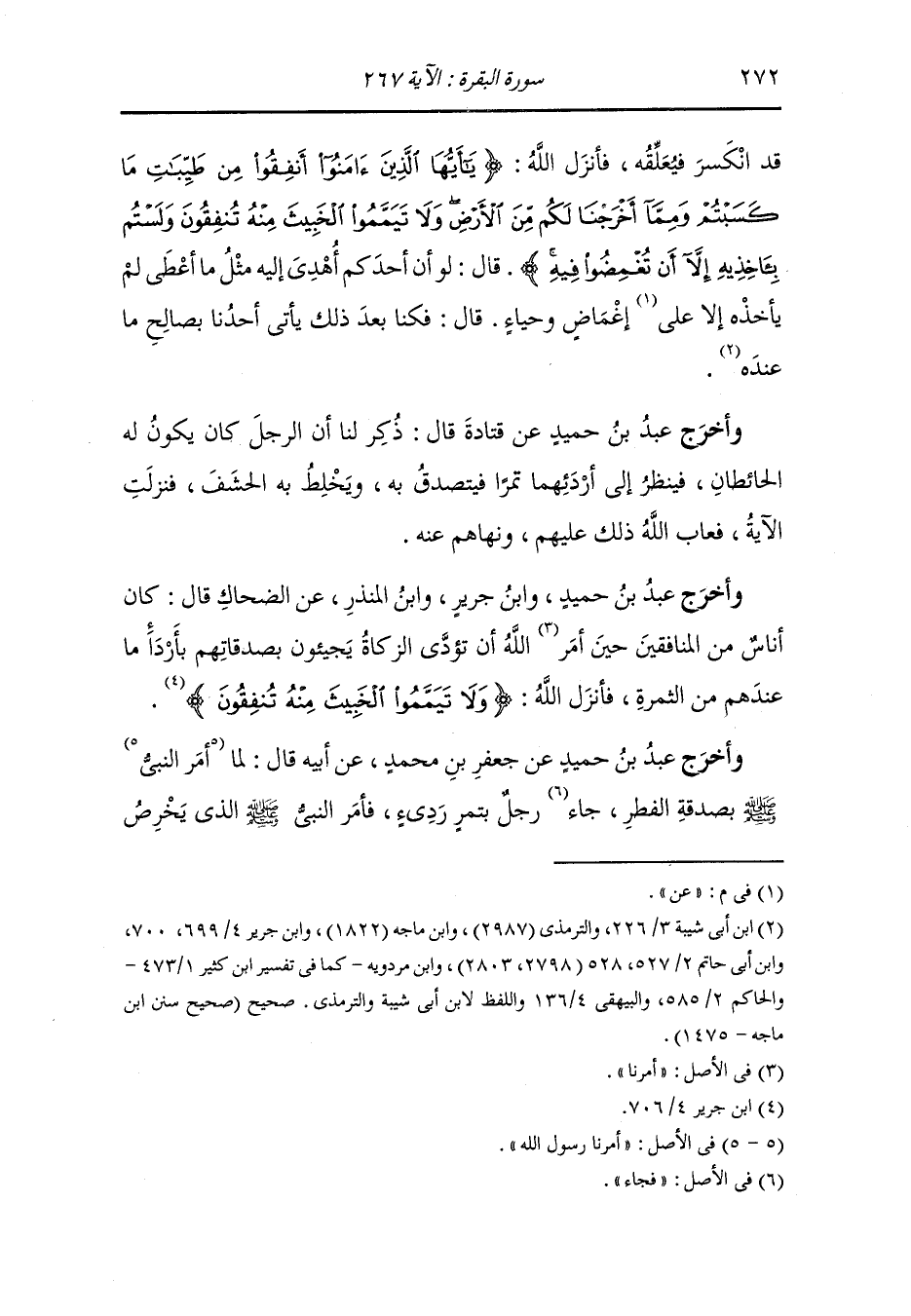 أخرج ابن أبي شيبة ، وعَبد بن حُمَيد والترمذي وصححه ، وَابن ماجه ، وَابن جَرِير ، وَابن المنذر ، وَابن أبي حاتم ، وَابن مردويه والحاكم وصححه والبيهقي في "سُنَنِه" عن البراء بن عازب في قوله {ولا تيمموا الخبيث منه تنفقون} قال : نزلت فينا معشر الأنصار كنا أصحاب نخل كان الرجل يأتي من نخله على قدر كثرته وقلته وكان الرجل يأتي بالقنو والقنوين فيعلقه في المسجد وكان أهل الصفة ليس لهم طعام فكان أحدهم إذا جاع أتى القنو فضربه بعصاه فيسقط البسر والتمر فيأكل وكان ناس ممن لا يرغب في الخير يأتي الرجل بالقنو فيه الشيص والحفش وبالقنو
