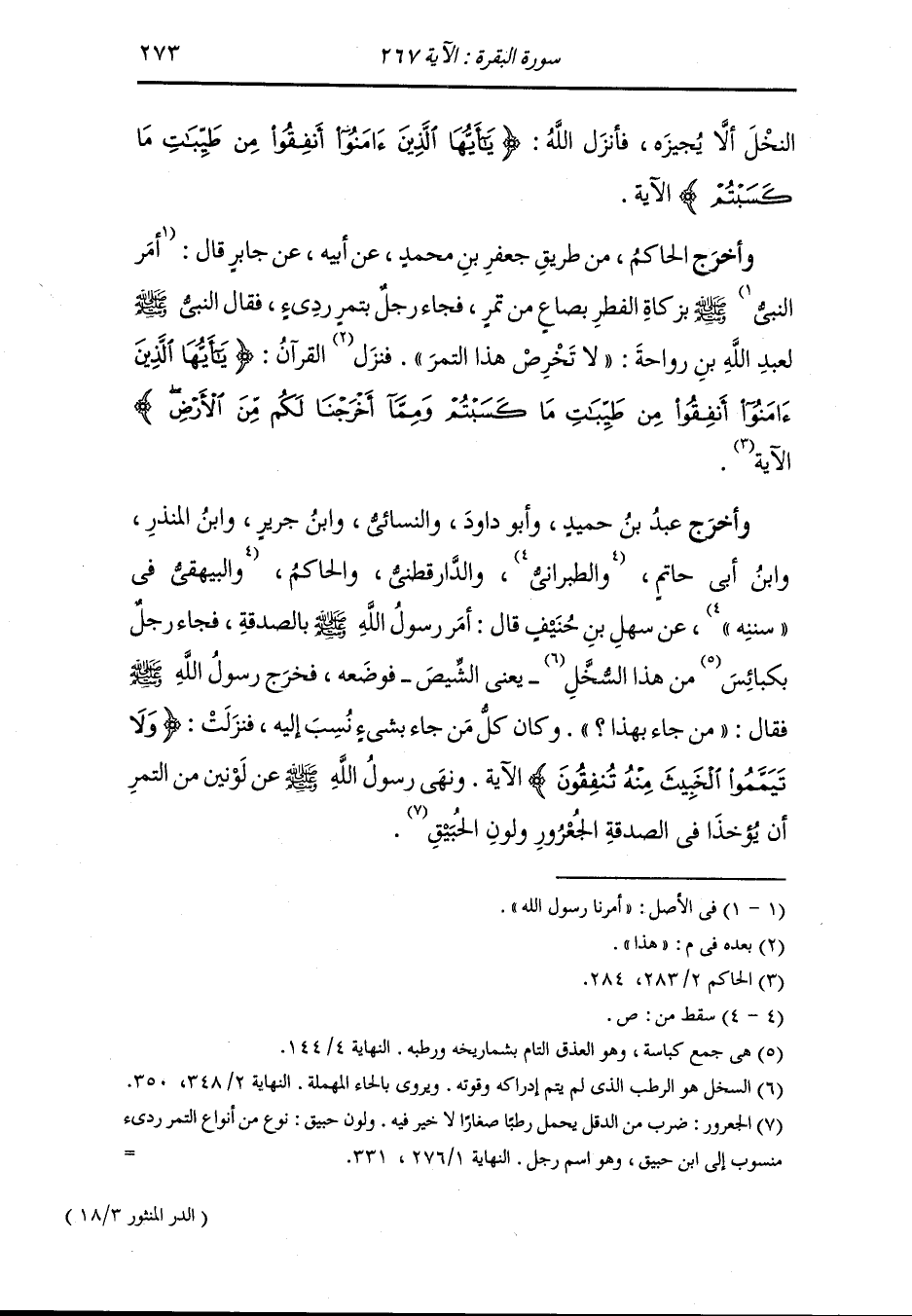 وأخرج عَبد بن حُمَيد عن قتادة قال : ذكر لنا أن الرجل كان يكون له الحائطان فينظر إلى أردئهما تمرا فيتصدق به ويخلط به الحشف فنزلت الآية فعاب الله ذلك عليهم ونهاهم عنه.