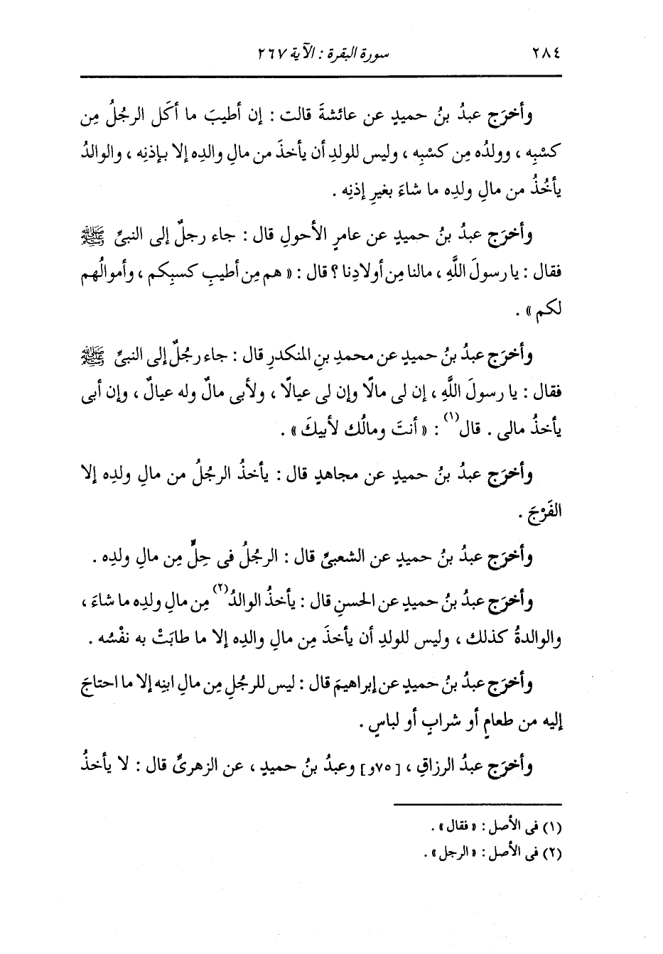 وأخرج عَبد بن حُمَيد عن عائشة قالت : قال الله : كلوا من طيبات ما كسبتم وأولادكم من أطيب كسبكم فهم وأموالهم لكم.