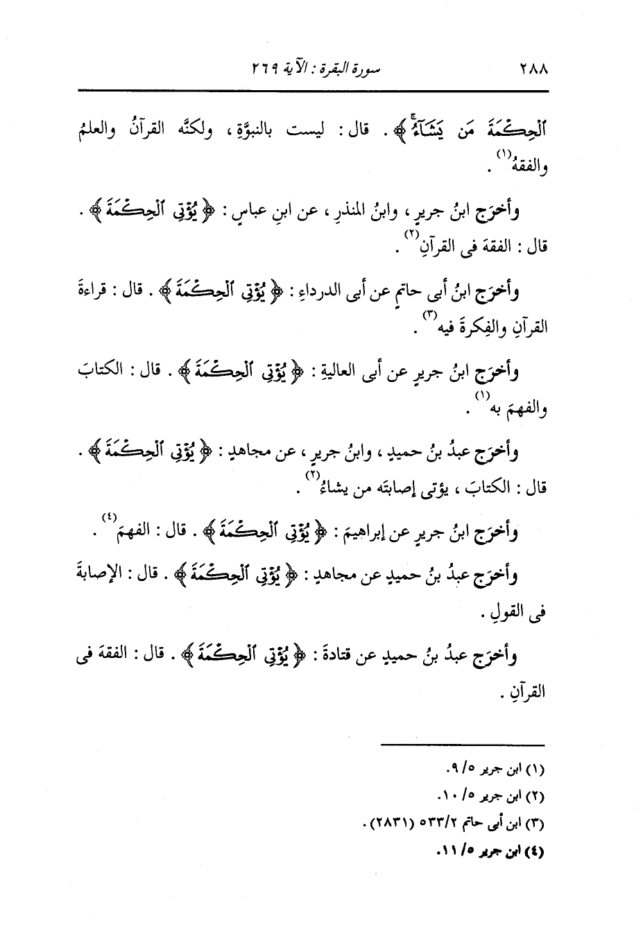 أخرج ابن جرير ، وَابن المنذر ، وَابن أبي حاتم والنحاس في ناسخه عن ابن عباس في قوله {يؤتي الحكمة من يشاء} قال : المعرفة بالقرآن ناسخه ومنسوخه ومحكمه ومتشابهه ومقدمه ومؤخره وحلاله وحرامه وأمثاله.