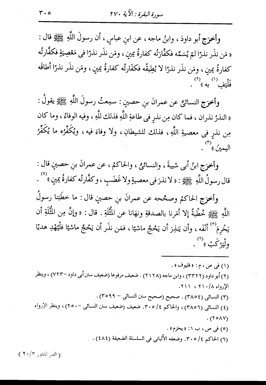 وأخرج أبو داود والنسائي ، وَابن ماجه عن عقبة بن عامر أنه سأل النَّبِيّ صلى الله عليه وسلم عن أخت له نذرت أن تحج حافية غير مختمرة ، فقال : مروها فلتختمر ولتركب ولتصم ثلاثة أيام.