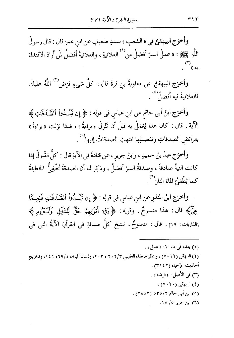 أخرج ابن جرير ، وَابن المنذر ، وَابن أبي حاتم عن ابن عباس {إن تبدوا الصدقات فنعما هي وإن تخفوها وتؤتوها الفقراء فهو خير لكم} فجعل الله صدقة السر في التطوع تفضل على علانيتها سبعين ضعفا وجعل صدقة الفريضة علانيتها أفضل من سرها بخمسة وعشرين ضعفا وكذلك جميع الفرائض والنوافل في الأشياء كلها