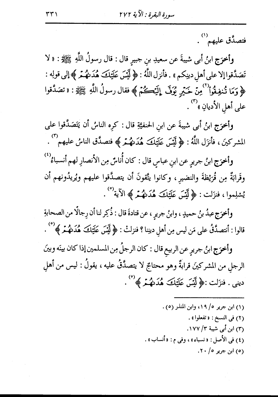 وأخرج ابن جرير ، وَابن المنذر عن سعيد بن جبير قال كان النَّبِيّ صلى الله عليه وسلم لا يتصدق على المشركين فنزلت {وما تنفقون إلا ابتغاء وجه الله}