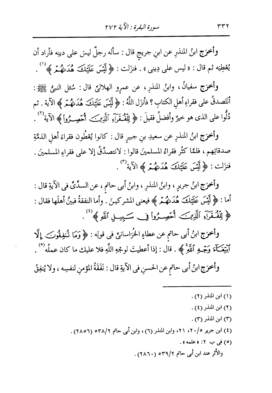 وأخرج ابن جرير عن ابن عباس قال : كان أناس من الأنصار لهم أنساب وقرابة من قريظة والنضير وكانوا يتقون أن يتصدقوا عليهم ويريدونهم أن يسلموا فنزلت {ليس عليك هداهم} الآية.