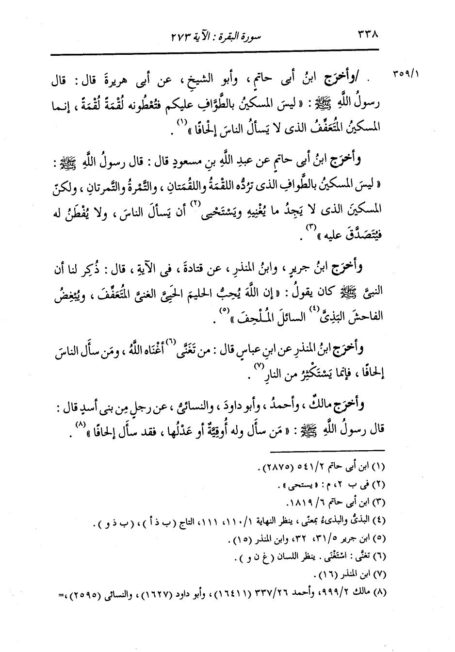 وأخرج البخاري ومسلم وأبو داود والنسائي ، وَابن المنذر ، وَابن أبي حاتم ، وَابن مردويه عن أبي هريرة قال : قال رسول الله صلى الله عليه وسلم ليس المسكين الذي ترده التمرة والتمرتان واللقمة واللقمتان إنما المسكين الذي يتعفف واقرأوا إن شئتم {لا يسألون الناس إلحافا}