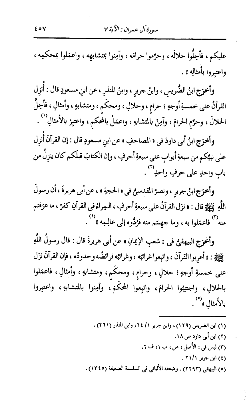 وأخرج ابن جرير والحاكم وصححه وأبو نصر السجزي في الإبانة عن ابن مسعود عن النَّبِيّ صلى الله عليه وسلم ، قال كان الكتاب الأول ينزل من باب واحد على حرف واحد ونزل القرآن من سبعة أبواب على سبعة أحرف ، زاجر وآمر وحلال وحرام ومحكم ومتشابه وأمثال فأحلوا حلاله وحرموا حرامه وافعلوا بما أمرتم به وانتهوا عما نهيتم عنه واعتبروا بأمثاله واعملوا بمحكمه وآمنوا بمتشابهه وقولوا {آمنا به كل من عند ربنا} وأخرجه ابن أبي حاتم عن ابن مسعود ، موقوفا ، واخرج الطبراني عن عمر بن أبي سلمة أن النَّبِيّ صلى الله عليه وسلم ، قال لعبد الله بن مسعود إن الكتب كانت تنزل من السماء من باب واحد وإن القرآن نزل من سبعة أبواب على سبعة أحرف حلال وحرام ومحكم ومتشابه وضرب أمثال وآمر وزاجر فأحل حلاله وحرم حرامه واعمل بمحكمه وقف عند متشابهه واعتبر أمثاله ، فإن كلا من عند الله {وما يذكر إلا أولوا الألباب}.